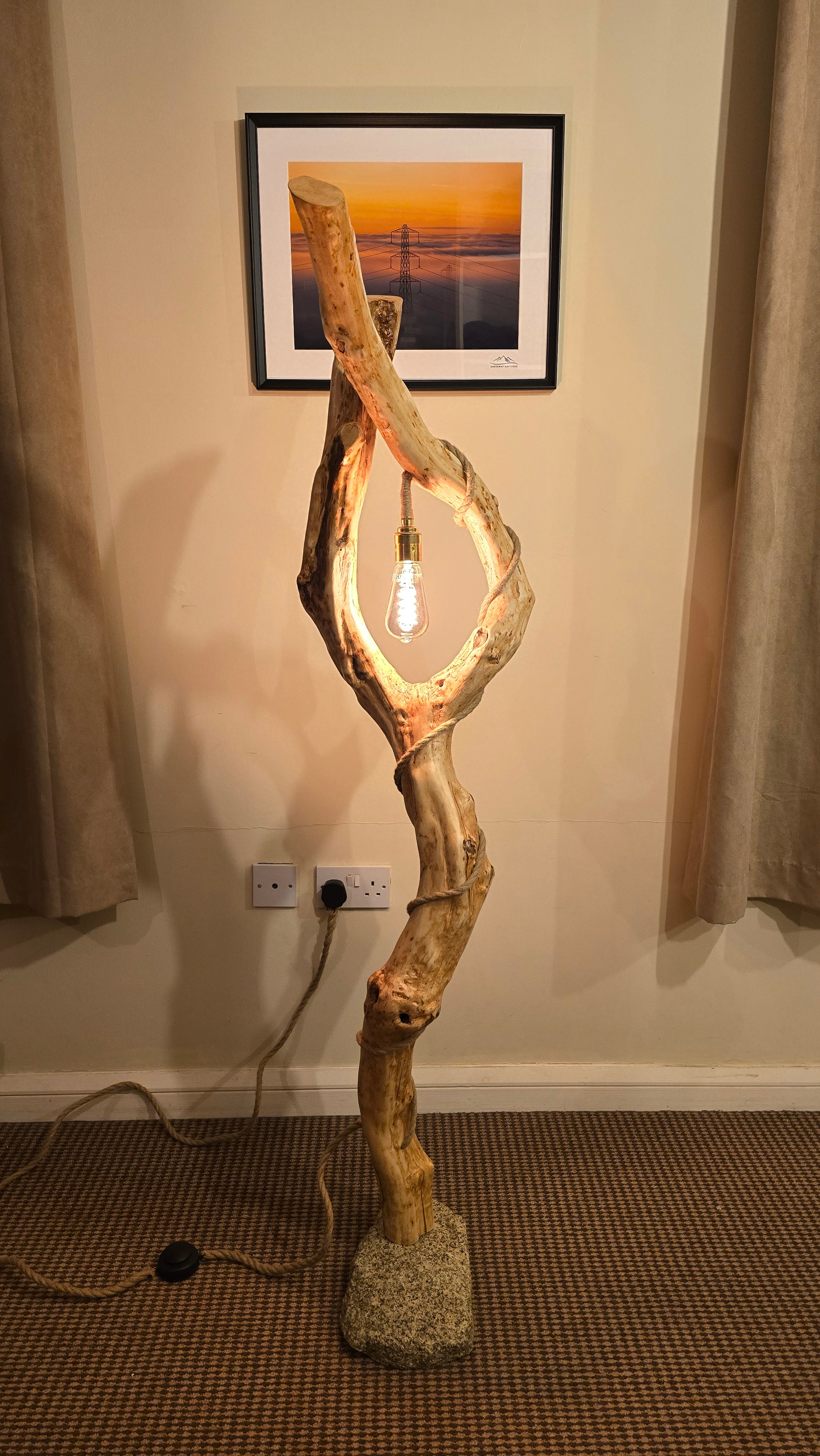 - Material: Driftwood, natural granite stone base, braided twine cable, brass bulb holder